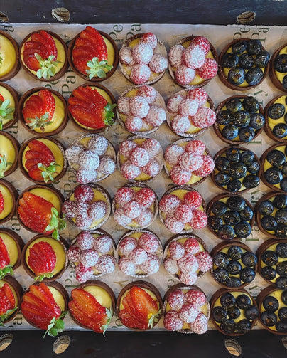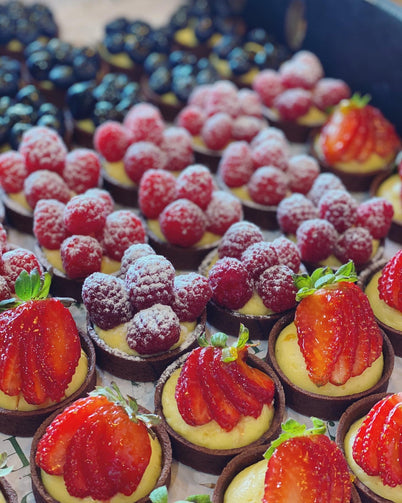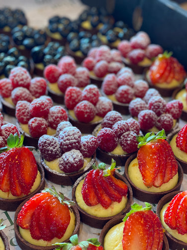Shortbread Shells filled with creme patissiere and topped with seasonal berries. Great for finger food parties. These shells are a medium shell approx 4cm **48 hours notice required**